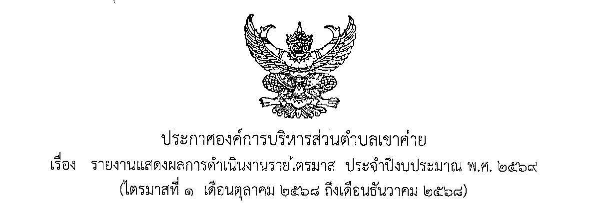 ประกาศองค์การบริหารส่วนตำบลเขาค่าย เรื่อง รายงานแสดงผลการดำเนินงานรายไตรมาส ประจำปีงบประมาณ พ.ศ.2569 (ไตรมาสที่ 1 เดือน ตุลาคม 2568ถึงเดือนธันวาคม 2568)