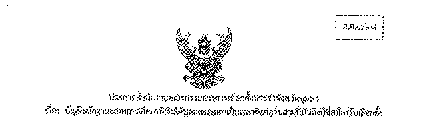 ประกาศสำนักงานคณะกรรมการการเลือกตั้งประจำจังหวัดชุมพร เรื่อง บัญชีหลักฐานแสดงการเสียภาษีเงินได้บุคคลธรรมดาเป็นเวลาติดต่อกันสามปีนับถึงปีที่สมัครรับเลือกตั้ง